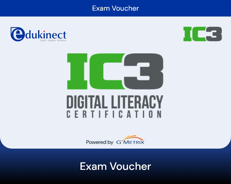 This product includes one IC3 Digital Literacy exam voucher with proctoring service through Edukinect and is valid for 1 year from purchase. This voucher can be used for any of the IC3 Digital Literacy Certification examinations: Computing Fundamentals, Key Applications, and Living Online. Please contact Edukinect at info@edukinect.com to book your exam.
